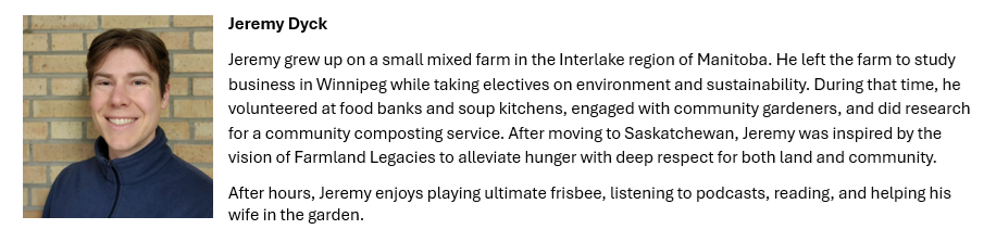 Joel Mowchenko, Executive DirectorJoel has an eclectic background that has taken him in many different directions. Looking back, many of the signposts now align with his role at Farmland Legacies. He has an educational background in Sociology, Theology, Agriculture, and Governance. He’s worked extensively in the non-profit and co-operative sectors, both as a volunteer and a staff member. He and his wife Cheryl spent 15 years living on and managing the family farm near Mossbank, SK, growing organic crops and raising grassfed beef. And, just for fun, they spent a few years running a farm to table restaurant featuring beef from their ranch. There is certainly a sense of Providence as Joel now sees these various threads tying together in his work with Farmland Legacies.